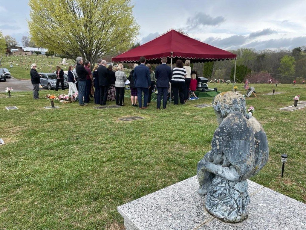 The McGill sisters also donated the plot in a special “Angels” section of their cemetery and partnered with Matthews International, who provided the casket for both sets of cremains. Both the McGill Sisters and Matthews International covered the cost of the memorial plague. Lee-Heights Monument provided the service of opening and closing of the grave. Simerly Vault Company donated the vault. West End Florist in Loudon donated floral arrangements.