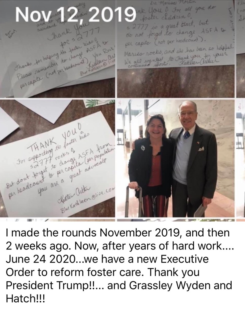 With all of the major national issues swarming and demanding his attention, ie, pandemic, riots, etc., I am wondering g how this important, but under the radar issue finally made it to his desk. I want to believe that the 1,000 postcards and 300 letters we sent from Family Forward Project may have helped. I want to believe that our multiple trips to DC as grassroots lobbyists and citizens helped. I want to believe that Senator Grassley who has been a warrior for child welfare carried this to his desk. Something or someone helped moved this to his attention. Don’t ever believe that your voice does not matter.