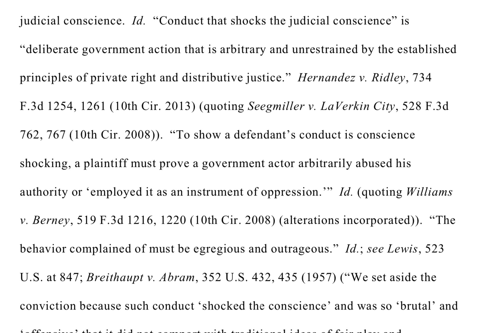 Note – analysis of substantive due process – the courts consideration of (1) a fundamental liberty interest vs (2) shock the conscious conduct by state actors.